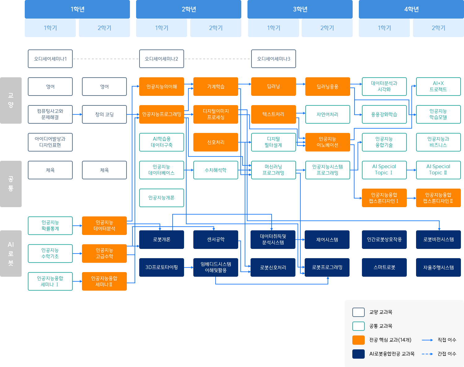 교양/공통과목 필수교과목 단일전공 - 오디세이세미나3, 인공지능융합캡스톤디자인 | 복수전공 - 인공지능융합캡스톤디자인 | 23학번 이전 입학생은 인공지능융합캡스톤디자인 | 또는 Ⅱ 이수 권장. 24학번 이후 입학생은 인공지능융합캡스톤디자인 | 이수 필수. 교양/공통/AI의료 교양/공통/AI로봇 교양/공통/AI기술경영