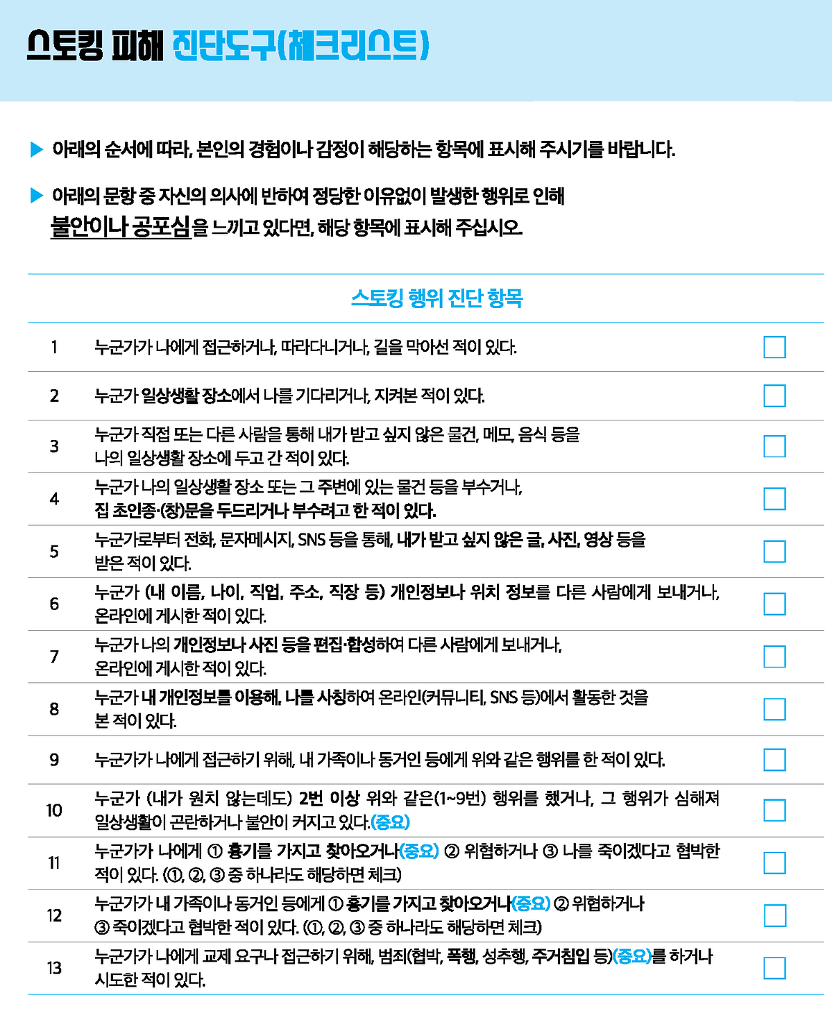스토킹 피해 진단도구(체크리스트)는 다양한 유형의 스토킹 행위 여부를 판단·인지하여, 주변 또는 기관에 도움을 요청할 수 있도록 하기 위해 만들어졌습니다.