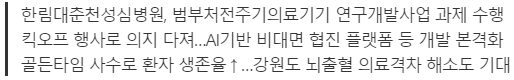 한림대춘천성심병원은 정부과제 선정으로 2025년 12월까지 총 3년 9개월간 정부로부터 22억5000만원의 국비를 지원받아 뇌출혈환자의 진단과 치료를 위한 EMR연계 뇌출혈 통합솔루션을 탑재하고 비대면 협진 플랫폼 선도기술을 개발할 예정이다.