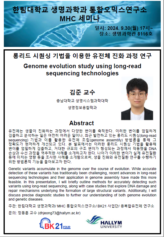 [MHC 세미나] 롱리드 시퀀싱 기법을 이용한 유전체 진화 과정 연구김준 교수