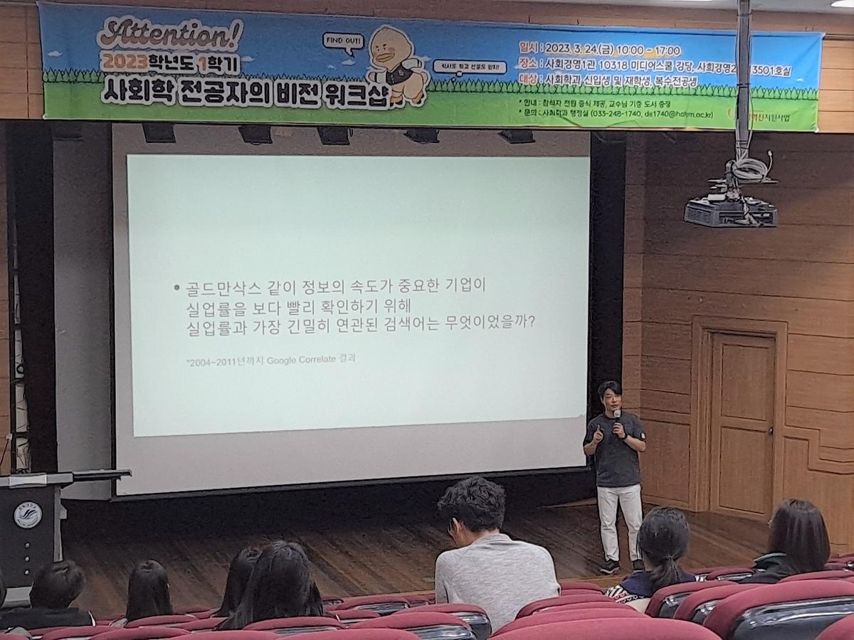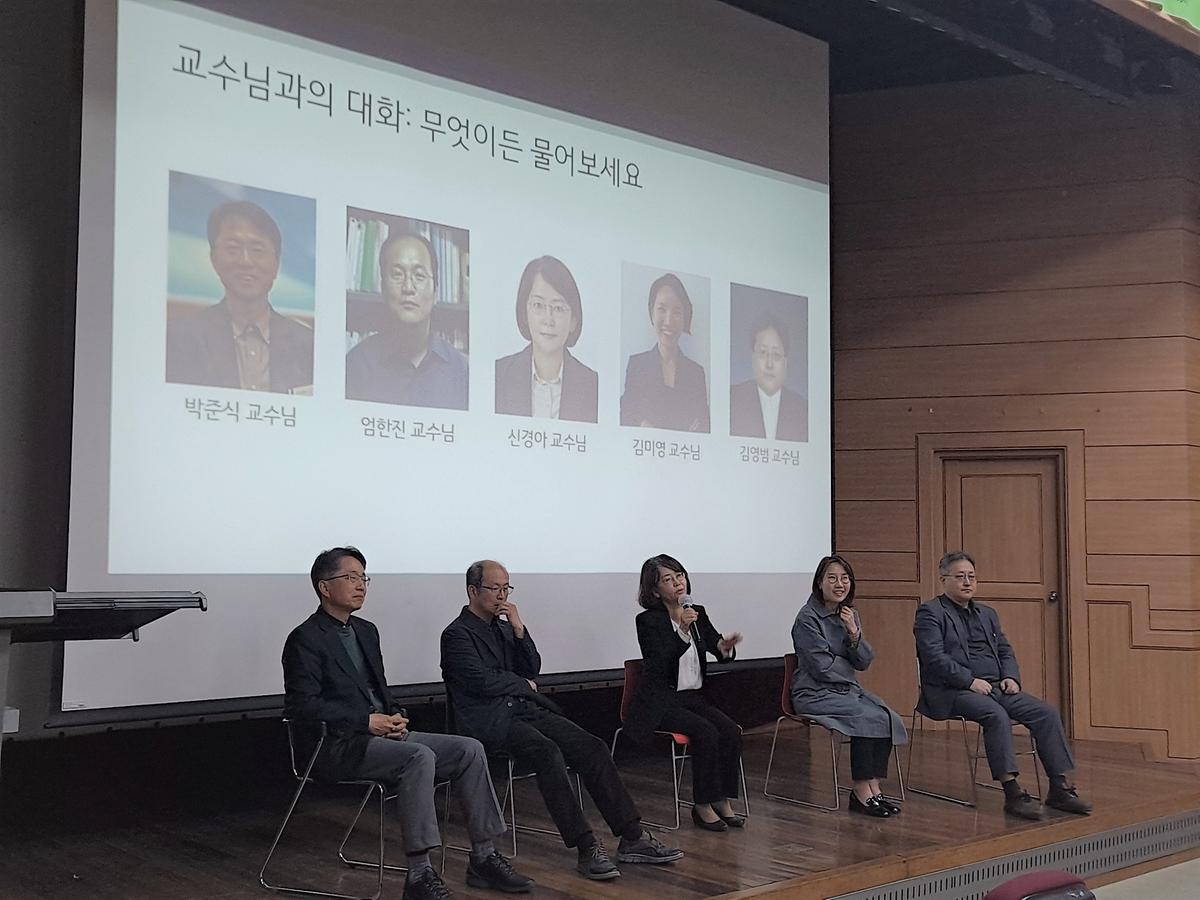 손영석 사회과학대학장님과 박준식 교수님의 축사와 선배들의 영상편지로 힘차게 시작해 성경륭 명예교수님의 특강, 동문이신 최윤재 사회학과 강사님과 허목화 강원도여성가족연구원 연구위원님의 특강까지 알찬 시간을 보냈다는 후문입니다. 또한 교수님들의 트랙 및 분야 소개, QnA에 이어 교수님들의 기증 도서를 학생들에게 선물하는 등 즐거운 만남이었습니다.