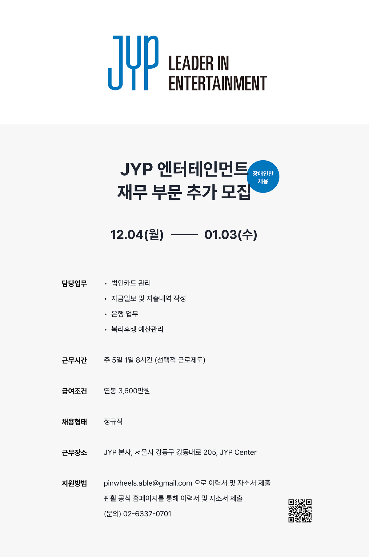 ■ JYP엔터테인먼트에서 아래와 같이 장애인재 채용을 실시하오니 확인 바랍니다.