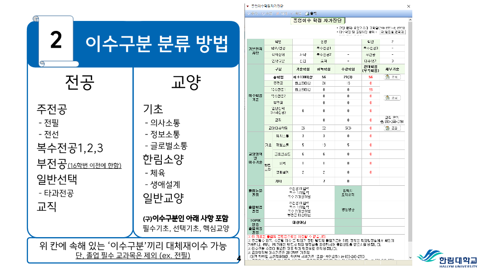 fnctId=bbs,fnctNo=487 RSS 2.0 게시물 검색 제목 작성자 검색어 입력창 게시글 리스트 등급기준 등 성적평가 방식 안내 성적<시험>시험은 정기시험, 비정기시험, 추가시험, 재시험 등으로 구분한다.1) 정기시험 : 중간시험과 학기말시험으로 나누며 중간시험은 학기 당 수업일수 2분의 1이 되는 주에 실시하고, 학기말시험은 학기의 최종 주에 실시한다.2) 비정기시험 : 과제학습, 세미나 등 계속적인 학습활동을 평가하는 시험으로 담당교수의 책임 하에 실시한다.3) 추가시험 : 질병 또는 부득이한 사정으로 정기시험에 응시할 수 없는 학생은 사유와 증빙서류를 첨부하여 추가시험신청서를 제출하여 허가를 받아 정기시험 종료 후 2주일 이내에 추가시험에 응시할 수 있으며 이 경우 성적은 B+를 초과할 수 없다.4) 재시험 : 의과대학, 간호대학에 한하여 실시하며 의예과, 의학과 및 간호학과의 교과목 중 학기말 성적이 40-59점일 때 1회에 한하여 학기말시험 종료 후 2주일 이내에 재시험을 허가할 수 있으며, 성적은 C+를 초과 할 수 없다.시험 부정행위자의 처리1) 시험 중 부정행위가 적발되면 감독교수는 그 행위내용을 시험지 상단에 기록하고 날인한 후 즉시 총장에게 보고한다.2) 시험 부정행위자에 대하여는 다음의 내용에 따라 제적 또는 유기정학 처분한다.가) 제 적- 시험에 대리로 응시하거나 대리응시를 부탁한 경우- 시험지에 다른 사람의 이름을 쓰거나 쓰게 한 경우- 부정행위자로 적발되어 징계처분을 받은 사실이 있는 학생이 거듭 부정행위를 한 경우 나) 유기정학- 시험 중 책, 노트, 메모 등 허락되지 않은 것을 본 경우- 다른 학생의 답안지를 보거나 보여준 경우와 그 밖의 부정행위로 인정되는 행위를 한 경우 <성적>성적평가1) 성적평가는 각 교과목의 시험성적, 과제평가, 출석상황 및 학습태도 등을 종합하여 평가하되 출석 및 학습태도 10-20%, 정기시험 50-70%, 비정기시험 및 과제 20-30%로 함을 원칙으로 한다.2) 성적의 등급은 다음과 같이 분류하여 표기한다. 성적 등급 안내등급평점등급평점A+4.5D+1.5A04.0D01.0B+3.5F0.0B03.0P(Pass)없음C+2.5N(Non Pass)없음C02.0 3) 이수한 교과목의 성적이 D0급 이상 또는 P일 경우는 학점을 취득한 것으로 인정한다.4) 등급에 따른 백분위 기준점수 표 등급에 따른 백분위 기준점수 표 등급평점백분위 기준점수A+4.599A494B+3.589B384C+2.579C274D+1.569D164F0595) 전공과목의 성적평가 등급기준 전공과목의 성적평가 등급기준구분A이상B이상C~F비고이론35% 이하70% 이하잔여비율 3-3-0이론+실습40% 이하잔여비율 실습45% 이하 4-2-2예외과목50% 이하잔여비율 *예외과목: 15명 미만 과목, 영어과목, 교직과목 등*잔여비율: 담당교수 재량6) 기초․교양교과목의 성적평가 등급기준 기초․교양교과목의 성적평가 등급기준구분A이상B이상D~F비고일반과목30%60% 이하20%이하 예외과목절대평가 * 예외과목: 20명 미만 과목, 영어과목, RC과목 등* 출석 미달로 인해 F등급을 부여한 학생 및 교환학생은 등급 비율대상에서 제외7) 교과목 주당 수업시간의 3배를 초과하여 결석하였을 때 출석 미달로 F등급을 부여한다. 다만 담당 교수가 3배를 초과하지 않는 범위에서 자율적으로 정할 수 있으며, 수업계획서에 표시해야 한다. 또한, 3회의 지각은 한 번의 결석으로 본다.8) 학기 중 휴학한 학생의 휴학학기 성적은 인정하지 아니하며 그 학기의 수강신청은 취소된다.9) 각 교과목의 담당교수 및 강사는 학기말시험 종료 후 10일 이내에 담당교과목의 성적을 게시하고 통합정보시스템에 접속하여 웹으로 성적입력을 완료하여야 한다. <성적의 정정>1) 제출된 성적은 기재착오(성적의 오기 또는 누락) 등 부득이한 사유가 있는 경우에 한하여 총장의 허가를 받아 정정할 수 있다.2) 성적정정 절차가) 학생은 성적을 조회 확인하여야 하며, 성적에 이의가 있을 경우 담당교수에게 성적이의신청을 하여야 한다.나) 담당교수는 학생으로부터 이의신청을 받은 후 이를 검토하여 사유가 인정될 경우 학기말시험 종료 후 2주 이내에 사유서 및 증빙자료를 첨부한 성적정정원을 교무팀에 제출한다.다) 학생이 성적확인/정정기간에 정정신청을 하지 않은 경우에는 추후 성적에 대한 이의를 제기할 수 없다.3) 방학기간 중 수업, 해외현지수업 등 학기말시험 종료 후 10일 이내에 성적제출이 곤란한 교과목의 경우에는 성적제출 및 정정기간을 따로 정하여 시행할 수 있다. 성적평점평균의 계산1) 과목별 성적평점의 계산은 그 과목의 학점수와 성적등급의 평점을 곱하여 산출한다. 2) 성적평점평균의 계산은 학점을 사용한 가중평균법에 의하며, 소수 세째자리에서 반올림한다.3) 총 성적평점평균의 계산에는 재이수 교과목의 이전 성적은 산입하지 아니한다.4) 취득학점수가 다르고 성적평점평균이 동일한 경우에는 학점계가 많은 학생을 우선한다. 5) 성적등급이 P와 N으로 표시되는 교과목의 학점 및 성적은 성적평점평균 및 순위계산에서 제외한다.<성적경고와 유급, 우등생>1) 성적경고 가) 학기말 성적평점평균이 2.00 미만(의예과 2.20 미만)인 경우에는 예비성적경고를 한다.나) 신입생의 1학년 1학기 성적경고는 적용하지 아니한다. 다만, 의예과 학생은 