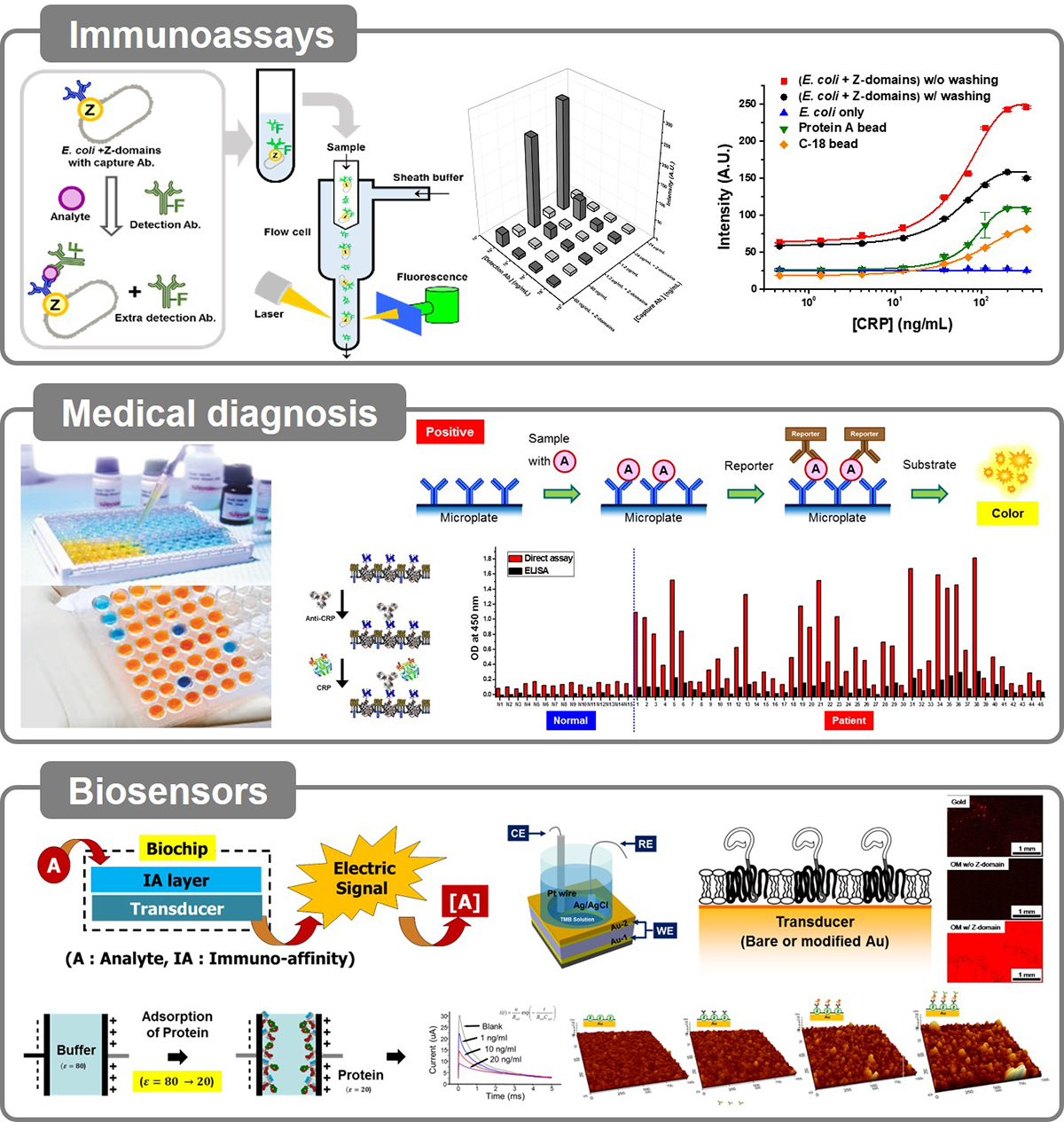 - MIN Lab.에서는 고감도의 진단검사 기술에 관련한 연구도 수행하고 있습니다. 이를 위해서 앞서 말씀드린 표면발현 기술을 면역검사에 적용하고 있습니다. 면역검사는 가장 널리 사용되고 있는 진단검사의 일종으로 항원-항체 반응을 활용하여 원하고자 하는 항원 또는 항체를 정량검사하는 방법입니다. 분자인식을 위해 가장 널리 사용되고 있는 항체는 Y자 형태의 단백질로, 2개의 항원과의 결합부위가 양쪽 가지 끝에 국소적으로 존재하고 있습니다. 이러한 구조적인 특징으로 인하여 고밀도의 항체고정화 기술이나, 항체의 배향조절 기술을 필요로 하고 있습니다. MIN Lab.에서는 배향조절을 위해 항체의 Fc부분과 결합특이성을 가지는 Z-domain을 표면발현의 타겟 단백질로 활용하여 대장균 외막에 발현하였습니다. 이러한 Z-domain은 오토디스플레이를 대장균 외막에 1.8∙105 copies/cell로 고밀도로 발현되어 있어 배향조절효과와 함께 밀도조절 효과까지 가지고 있습니다. 이 외에도 바이오틴과의 결합특이성을 가지는 streptavidin을 발현하여 진단검사에 응용하고 있습니다.